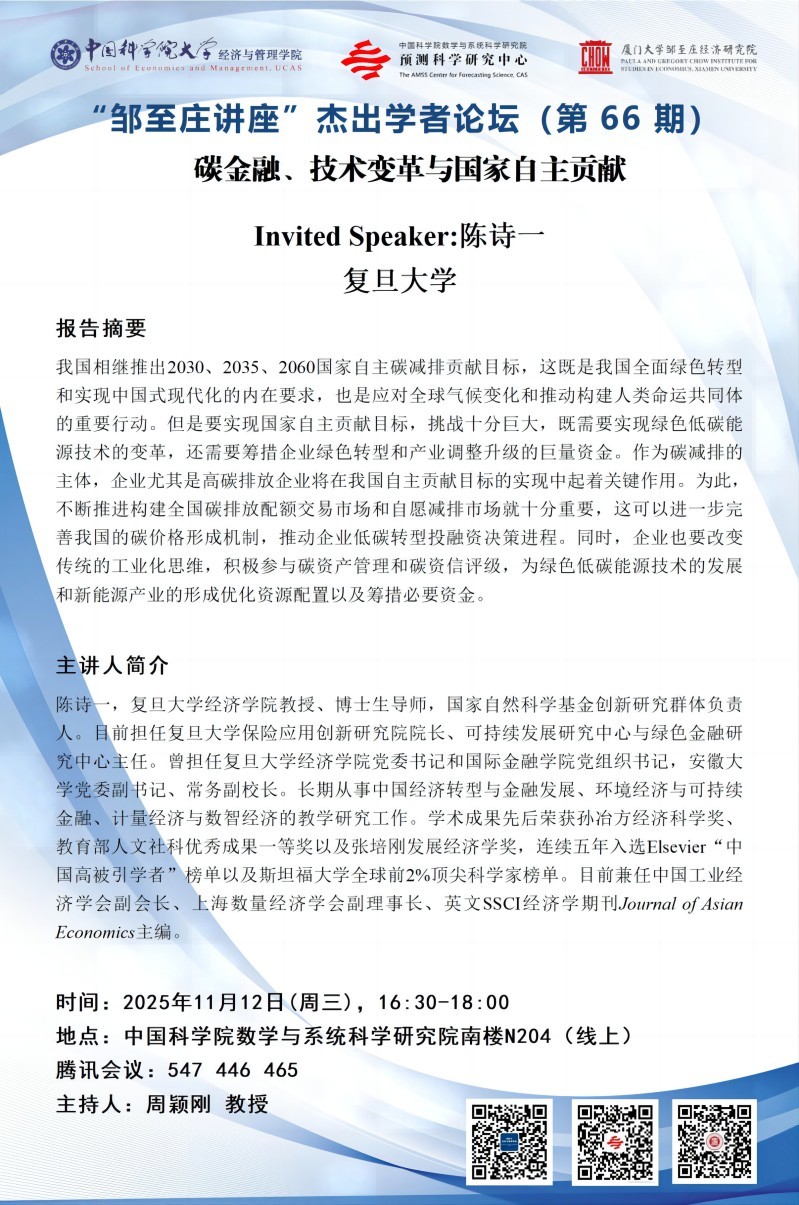 地点:中国科学院数学与系统科学研究院南楼N204(线上) 腾讯会议:547 446 465主讲人:陈诗一联系人:经管学院联系方式:01082680913开始时间:2025-11-12 16:30:00结束时间:2025-11-12 18:00:00内容: