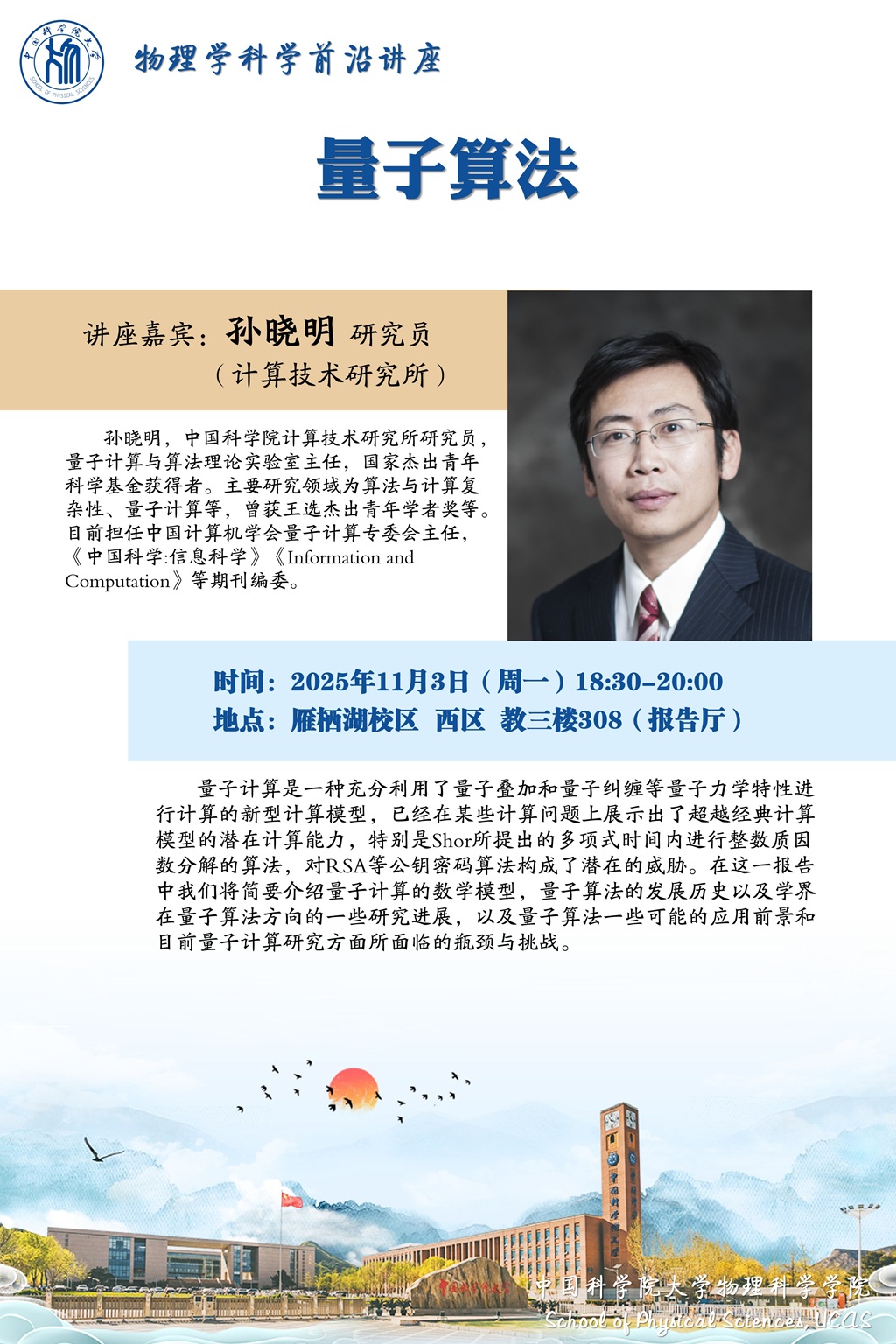 地点:雁栖湖校区 教三楼308(报告厅)主讲人:孙晓明 研究员(计算技术研究所)联系人:物理学院联系方式:69671664开始时间:2025-11-03 18:30:00结束时间:2025-11-03 20:00:00内容: