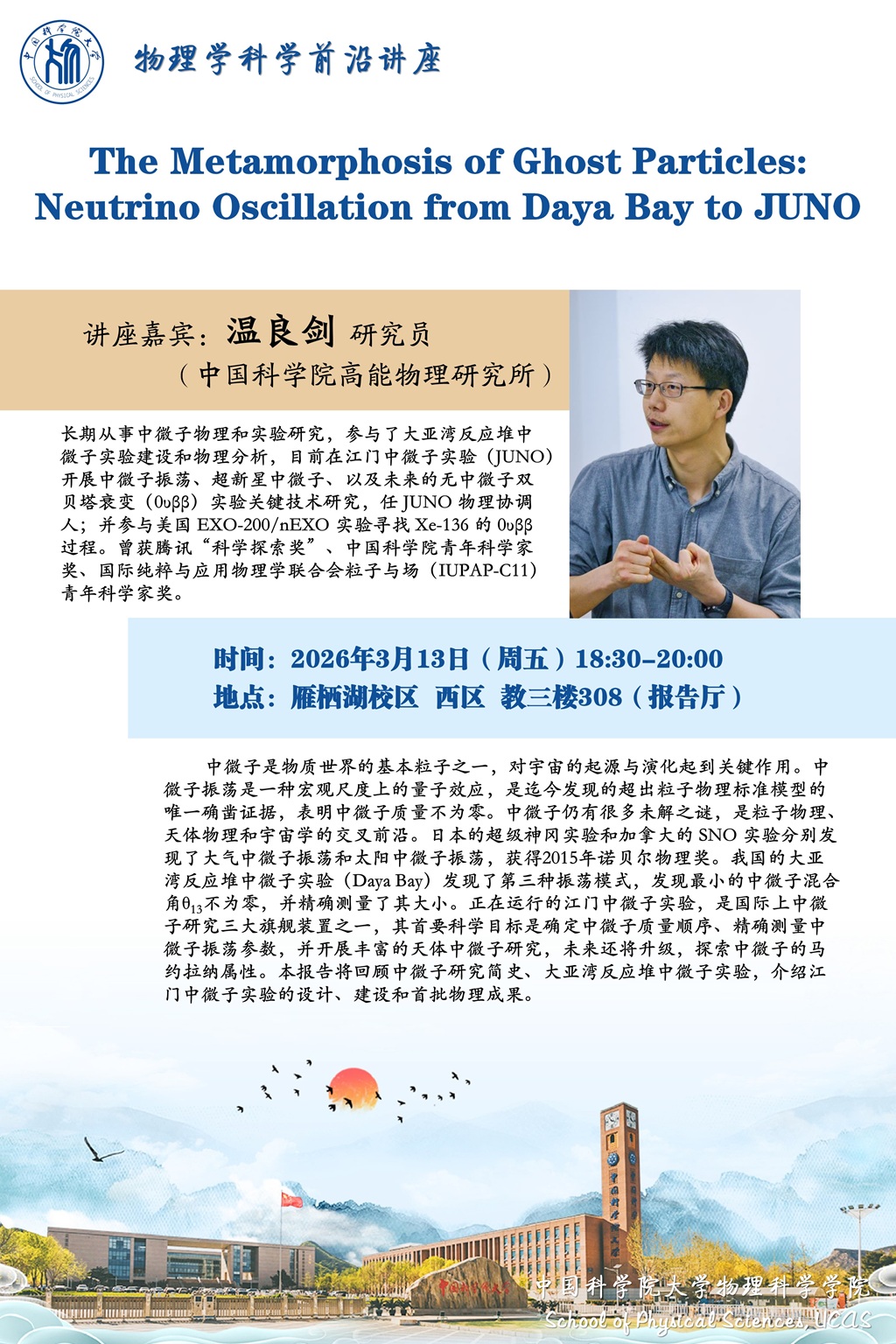 地点:雁栖湖校区 教三楼308(报告厅)主讲人:温良剑 研究员(高能物理研究所)联系人:物理学院联系方式:69671664开始时间:2026-03-13 18:30:00结束时间:2026-03-13 20:00:00内容: