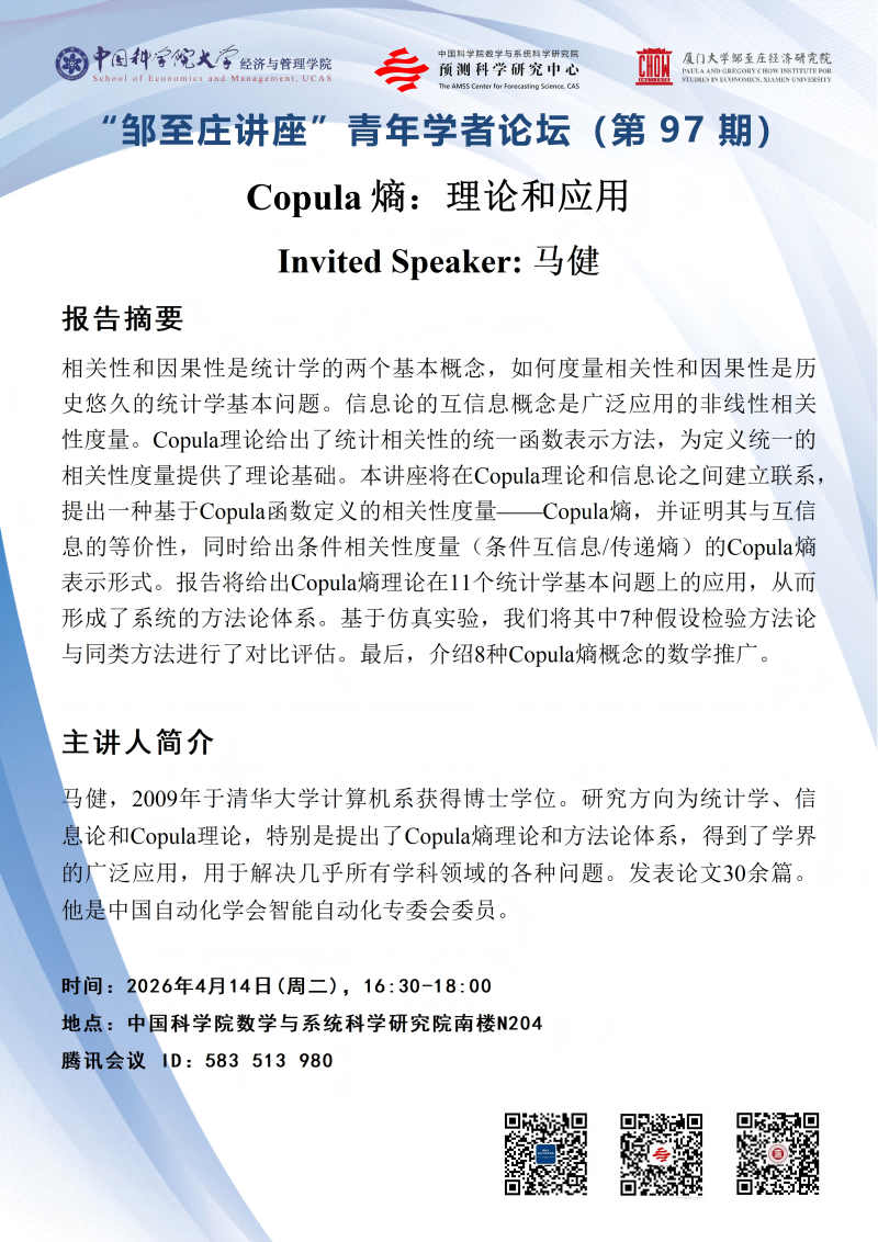 地点:中国科学院数学与系统科学研究院南楼N204 腾讯会议:ID:583 513 980主讲人:马健联系人:经管学院联系方式:01082680913开始时间:2026-04-14 16:30:00结束时间:2026-04-14 18:00:00内容: